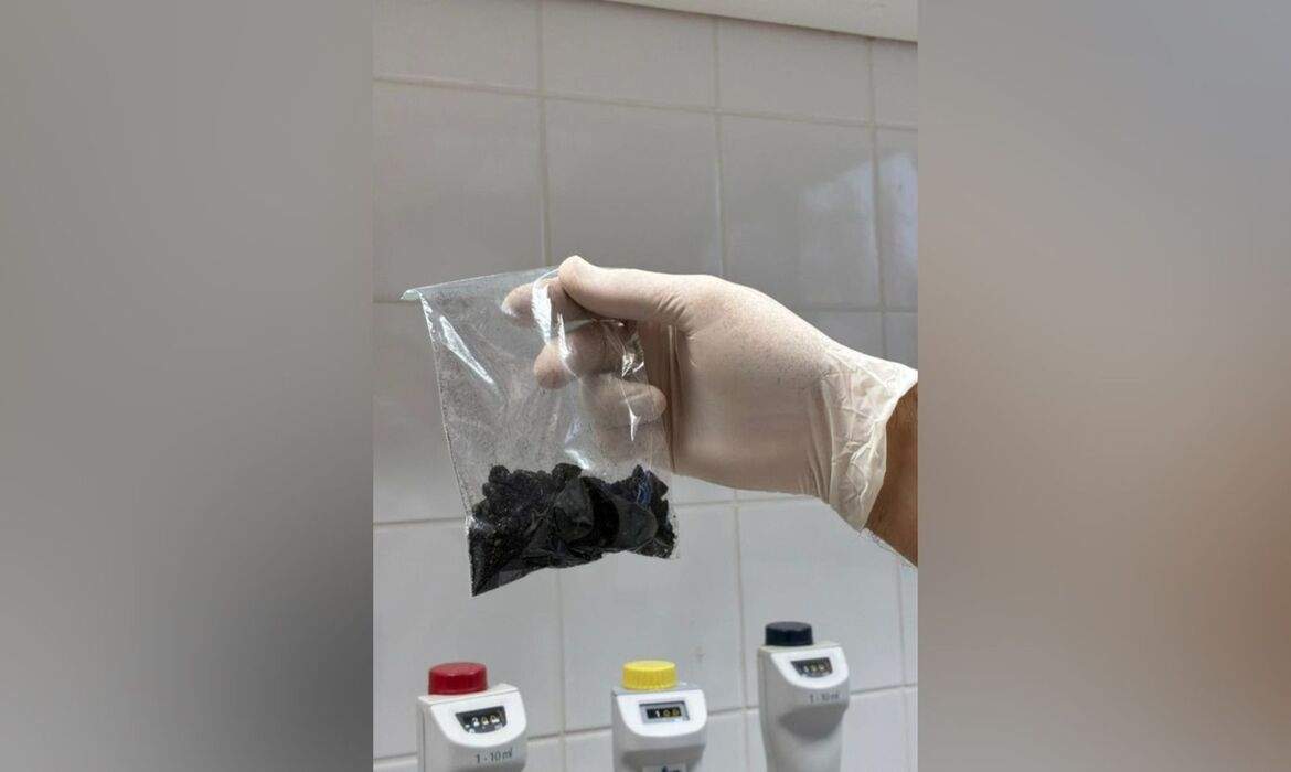 Durante os procedimentos de fiscalização, a bagagem foi submetida à inspeção por meio de equipamento de raio X, que revelou a presença de substância ilícita oculta entre as fibras de vidro nas paredes da mala de viagem.