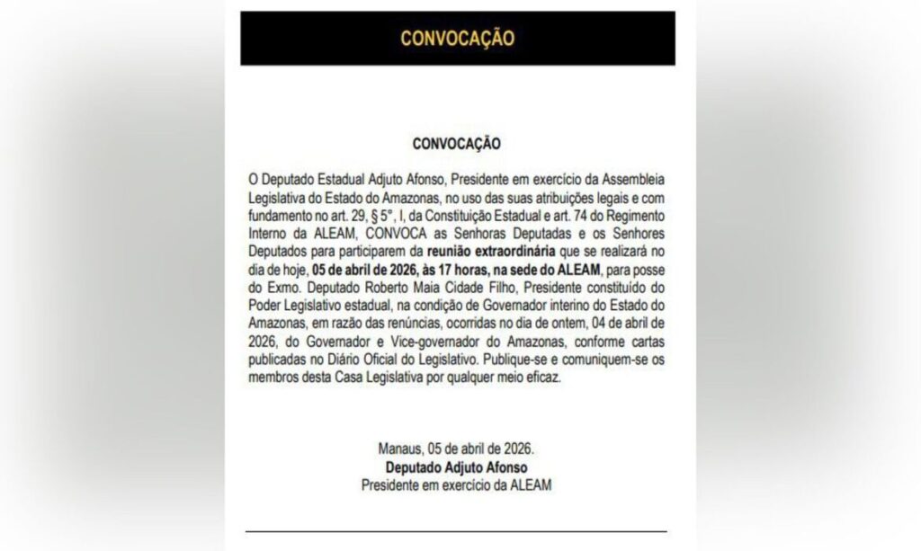 Manaus (AM) – A reviravolta política no Amazonas terá mais um capítulo decisivo neste domingo (5). O deputado estadual Roberto Cidade assume oficialmente o cargo de governador às 17h, em plena data de Páscoa, após as renúncias de Wilson Lima e Tadeu de Souza, anunciadas na noite anterior.